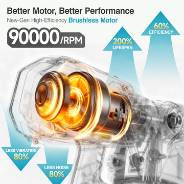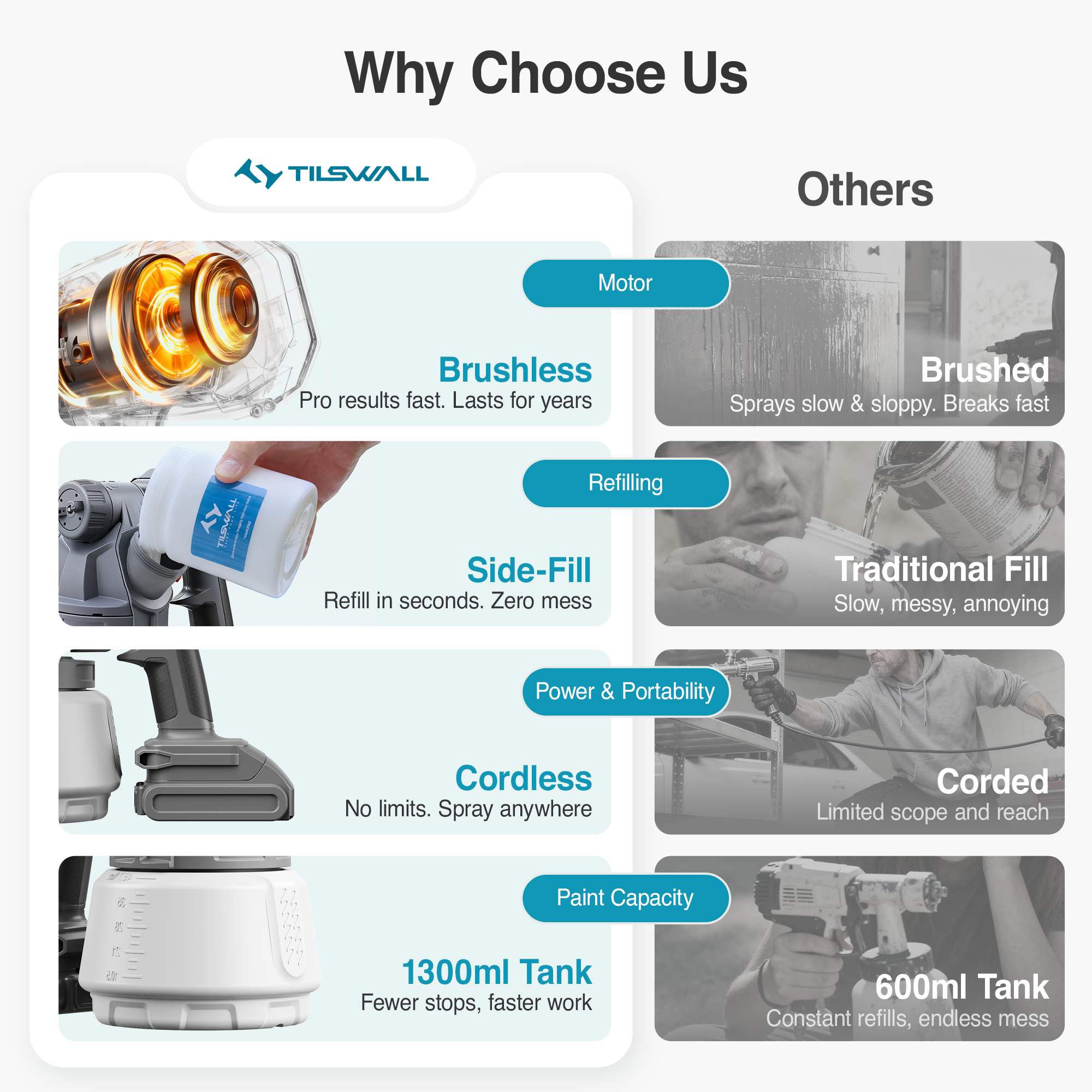 Experimente un rendimiento superior con nuestro motor sin escobillas de nueva generación de 90 000 RPM. La pistola de pintura inalámbrica Tilswall ofrece un acabado más uniforme y suave, con mucha menos vibración y ruido. Reduce la generación de calor durante el funcionamiento y proporciona una mayor vida útil para una mejor experiencia de pulverización.