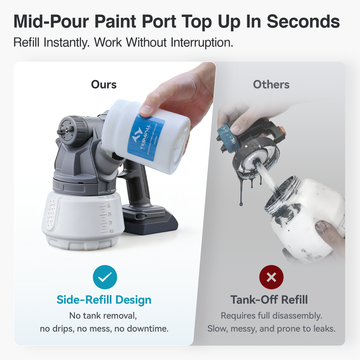 La pistola de pintura Tilswall Shark700 cuenta con un innovador diseño de llenado lateral que transforma la forma de rellenar la pintura. Cuando necesite rellenarla, no tendrá que desmontar todo el depósito. Simplemente podrá destapar la abertura lateral para añadir pintura de forma rápida y limpia. Esto maximiza la eficiencia y minimiza los derrames y las operaciones tediosas.