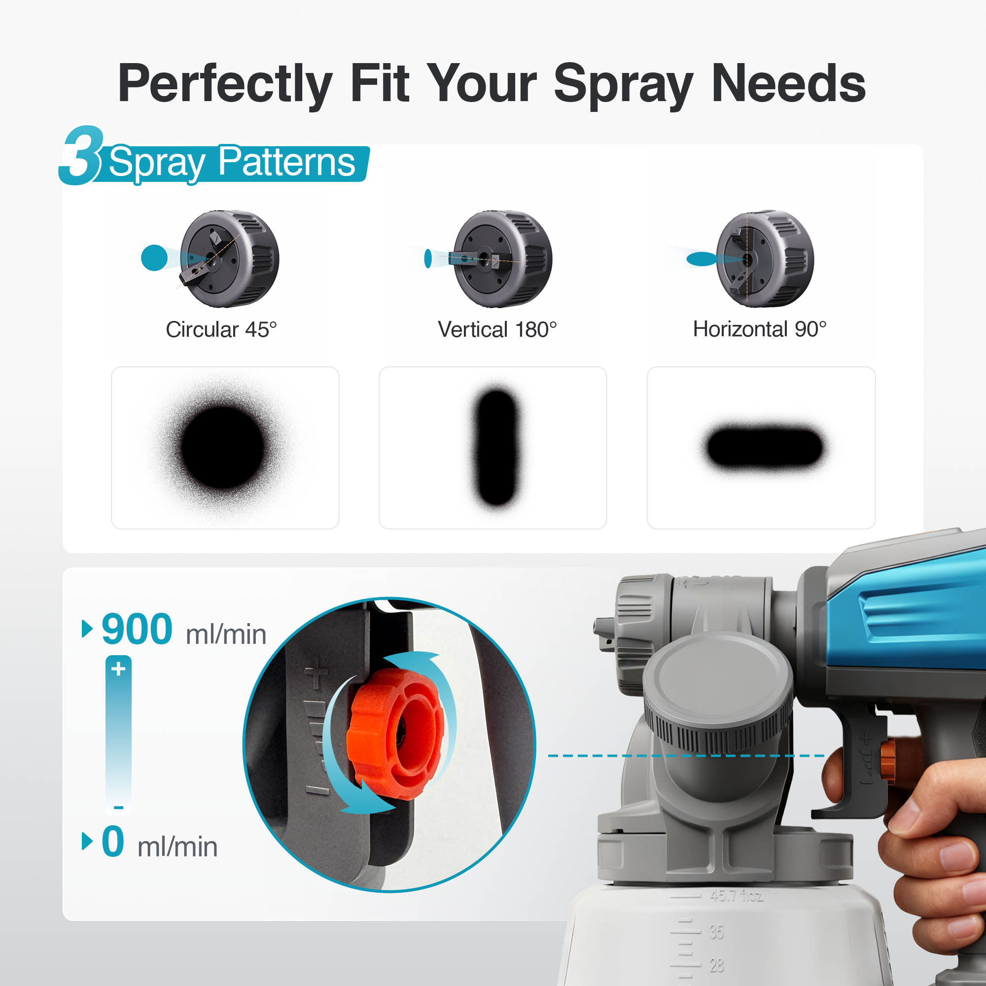 Consiga resultados profesionales y personalizados en cualquier proyecto. Esta pistola de pintura eléctrica inalámbrica ofrece tres patrones de pulverización (horizontal, vertical y circular) y un control de caudal variable (mín. 0 - máx. 900 ml/min) para adaptarse perfectamente a su tarea, desde el acabado de muebles delicados hasta la cobertura de grandes paredes. Le permite pulverizar con total confianza.